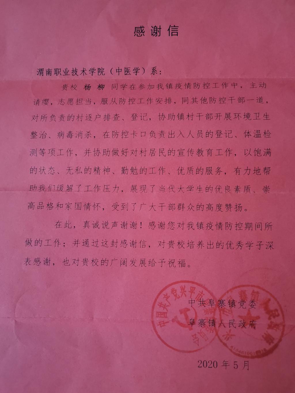 k8凯发中医高职1801班杨柳同学,在疫情防控期间,主动向当地镇政府请缨,希望发挥自己的专业特长,助力当地的疫情防控工作,以实际行动展现当代老员工的良好形象。按照中共阜寨镇党委的安排,就近就加入镇上疫情防控青年志愿者组织和青年突击队,协同其他镇村干部,对所负责的村逐户排查、登记,协助镇村干部开展环境卫生整治、病毒消杀,在防控卡口负责出入人员登记、体温监测等项工作,并利用自己所学的医学知识,协助村镇对村民的疫情防控宣传教育等工作。在疫情防控工作期间,以饱满的状态、无私的精神、优质的服务、有力地推进了村镇的疫情防控工作,分解了镇村干部的工作压力,做到了守岗有责,守岗尽责,为当地的疫情防控工作作出了贡献,由于表现突出,获得了当地村民的赞誉,受到了当地政府的表扬。